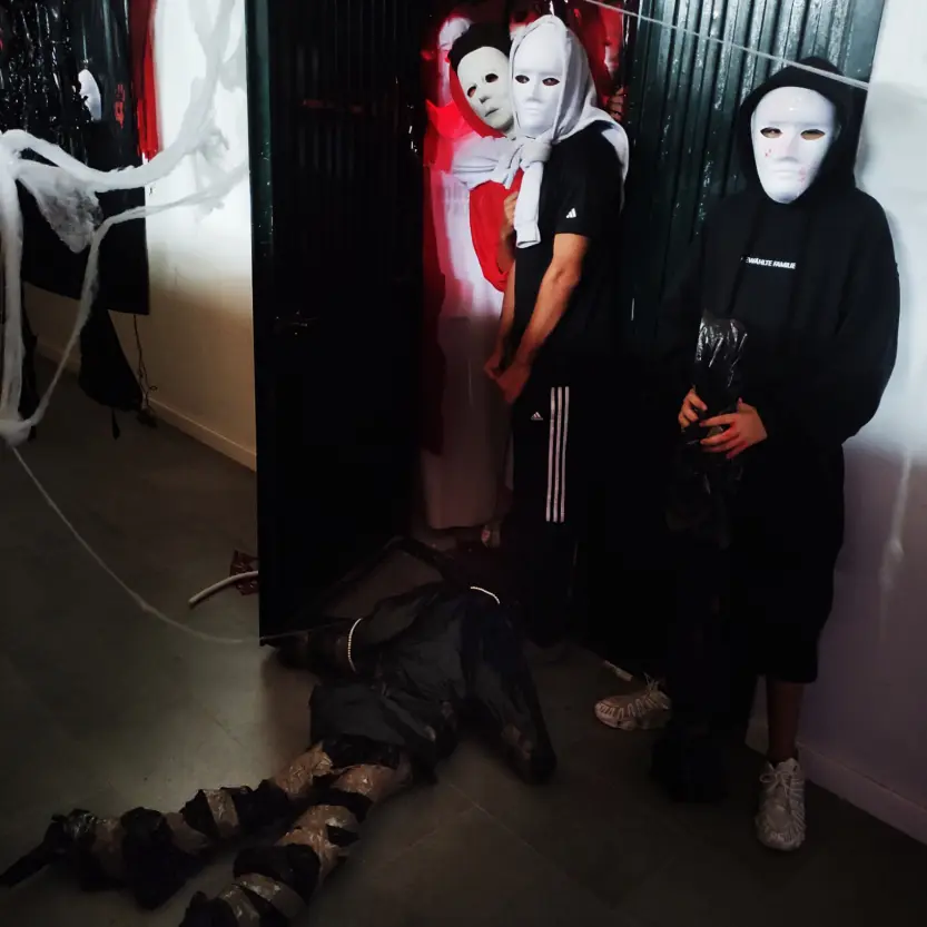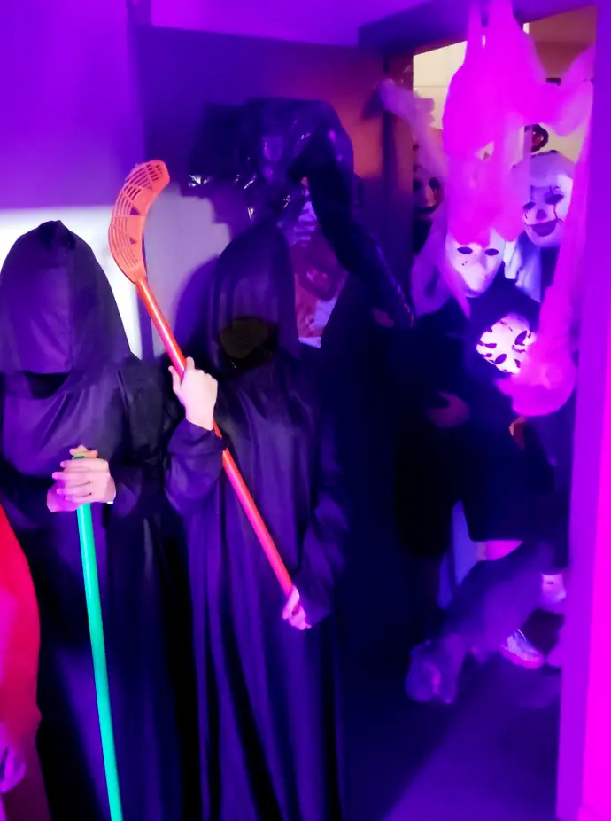 En Secundaria, los estudiantes participaron en diversas actividades mientras esperaban con entusiasmo el momento de bajar al esperado Espectáculo de la Casa Encantada. Como ya es tradición, el alumnado de 2º de Bachillerato, con la valiosa colaboración de sus compañeros/as de 1º de Bachillerato, diseñaron y pusieron en escena una Casa Encantada verdaderamente sobresaliente y muuuy espeluznante. Su creatividad, trabajo en equipo y dedicación convirtieron la experiencia en un momento inolvidable para toda la comunidad educativa.