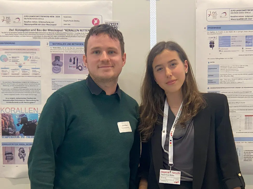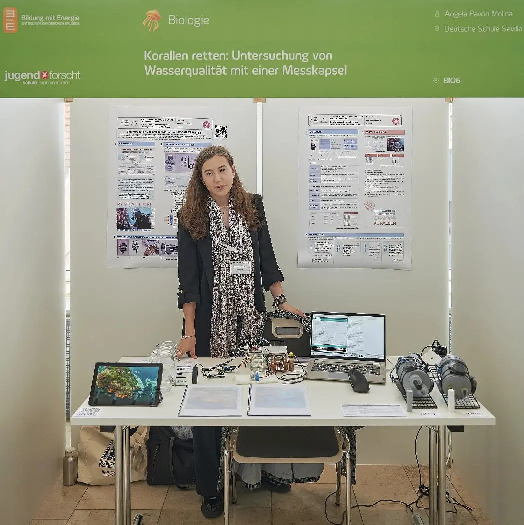 ¡Éxito en la última fase del concurso científico “JUFO: Schüler experimentieren”! Enhorabuena a nuestra concursante Ángela Pavón (3°ESO) por ganar un premio especial en la última fase del concurso en Nordrhein-Westfalen de alumnos hasta los 15 años! Después de haber conseguido el premio especial por mejor trabajo interdisciplinario en la fase regional al nivel peninsular, ahora ha convencido también a los jurados en Alemania con su maravilloso proyecto “Korallen retten: Untersuchung von Wasserqualität mit einer Messkapsel” (Salvar los corales: Investigación de calidad acuática con una cápsula de medición”).