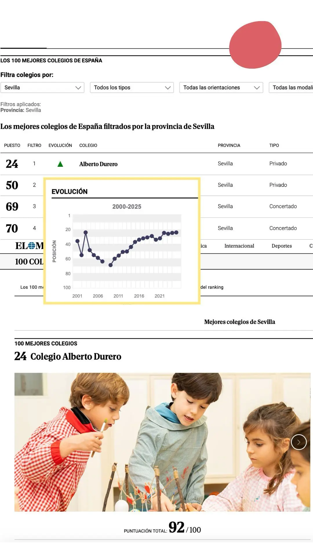 El diario El Mundo ha publicado un año más su conocido ranking de los 100 mejores colegios de España. En esta edición, nuestro centro, ha subido en el ranking, por lo que el COLEGIO ALEMÁN DE SEVILLA se encuentra en la posición 24ª de España, con lo que vuelve a colocarse como mejor colegio de Sevilla, y de nuevo como el mejor colegio de Andalucía, con un amplio margen respecto al segundo, logrando 92 puntos de los 100 posibles.